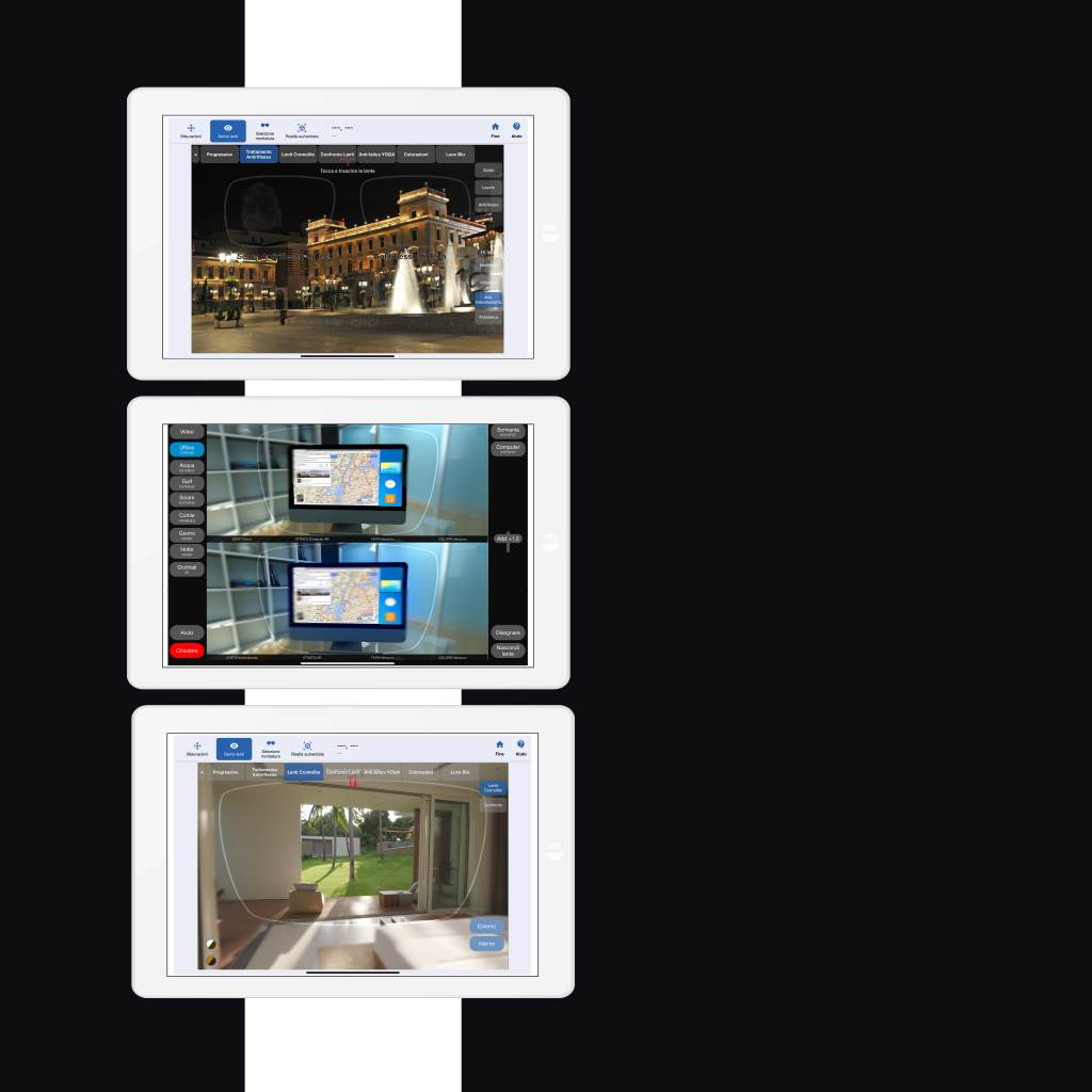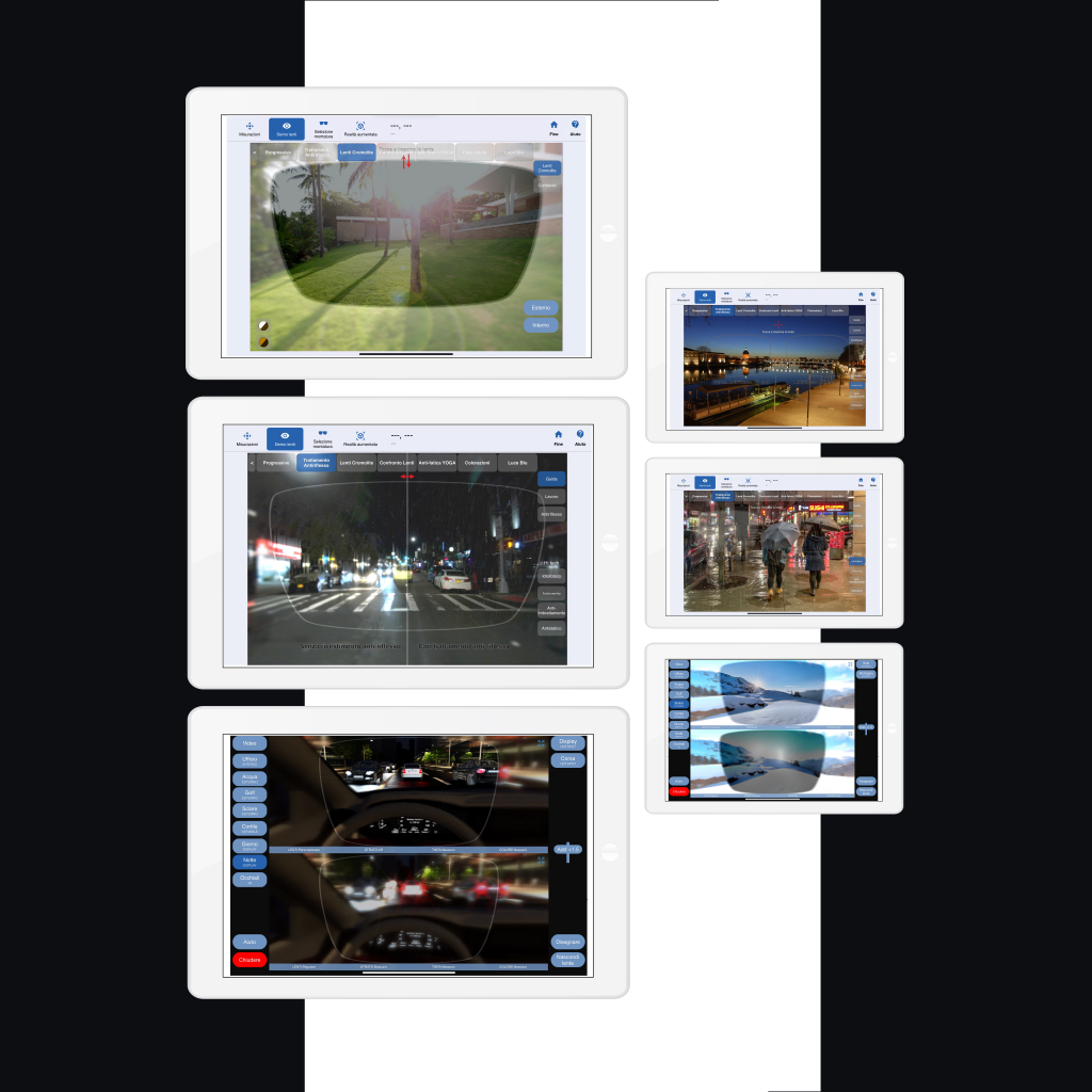 - Lenti progressive: un modulo dedicato mostra in modo immersivo le diverse geometrie di lente, aiutando il cliente a riconoscere il valore delle soluzioni più avanzate.